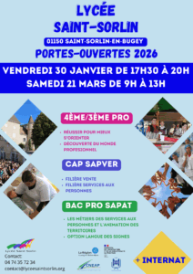 Le Lycée de Saint-Sorlin ouvre ses portes le 8 décembre 2025, de 17h30 à 21h30, à l’occasion de la Fête des Lumières. Au programme : plusieurs stands de ventes alimentaires et animations seront tenus par nos élèves et le personnel. Les bénéfices …